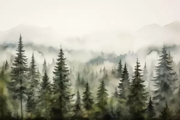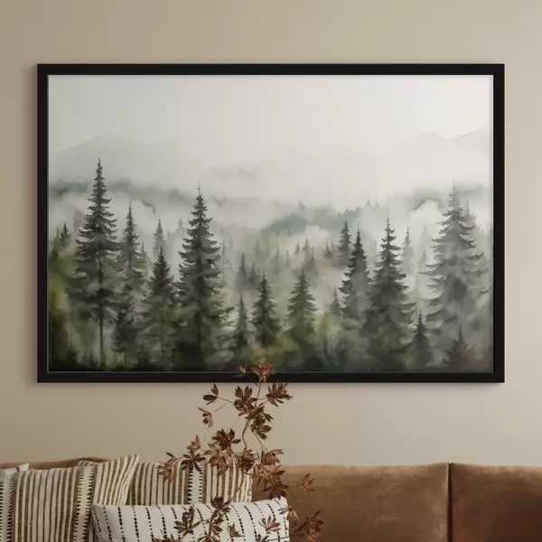 Poster Bosque verde sobre el fondo de montañas montañas y niebla acuarela f41241