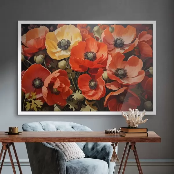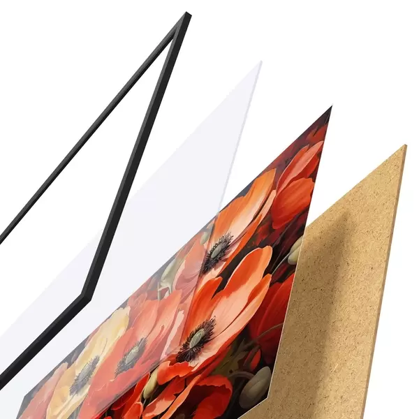 El póster consta de marco, plexiglás, imagen impresa y soporte de aglomerado. El póster puede colgarse inmediatamente en la pared gracias a los soportes de la parte posterior.