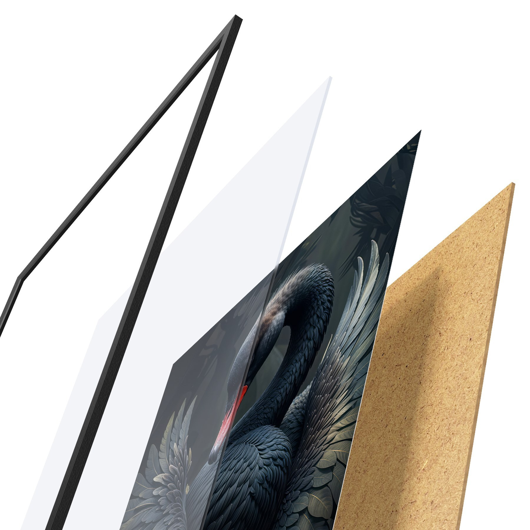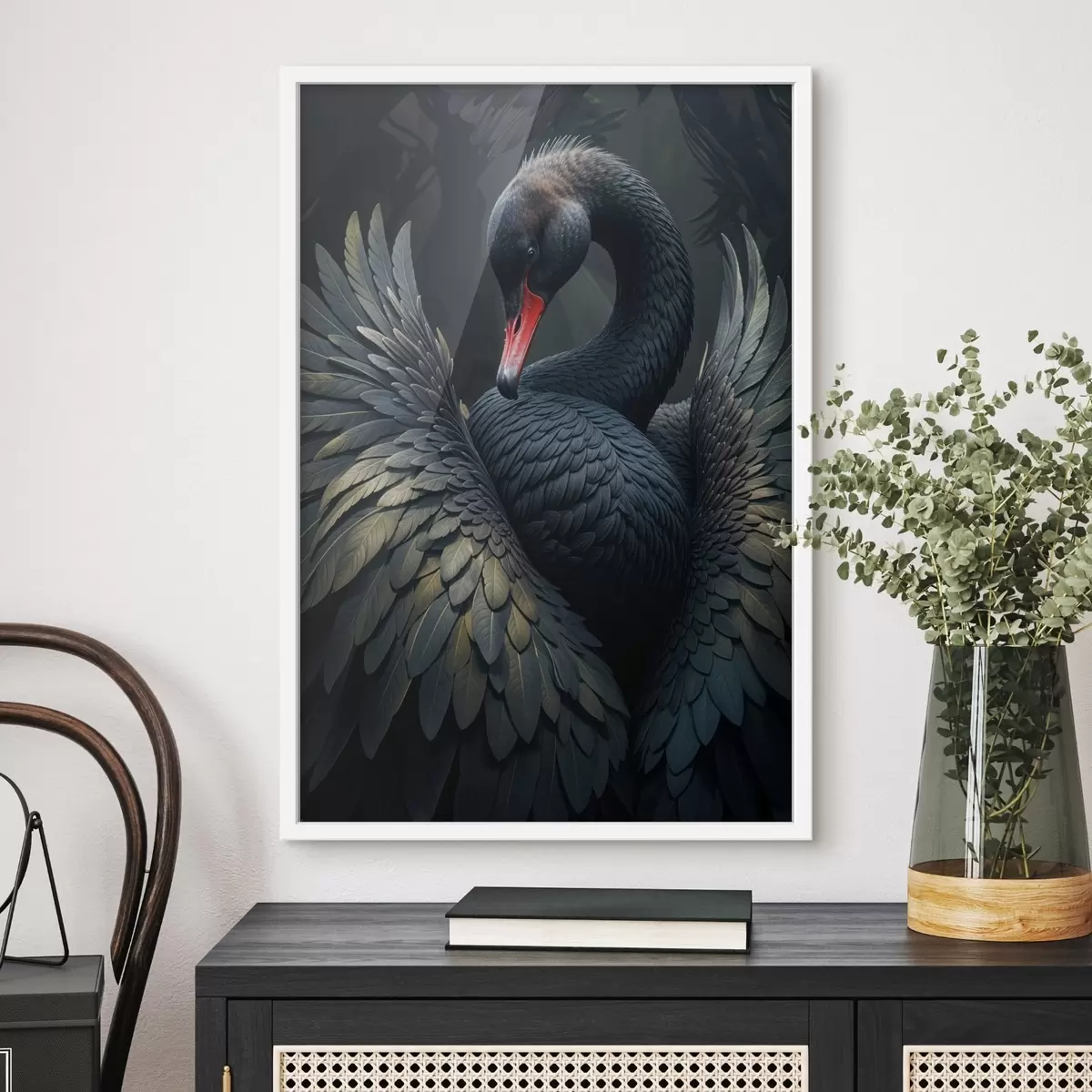 Poster Un cisne negro con las alas desplegadas, mostrando sus llamativas plumas negras y su pico rojo sobre un fondo oscuro f41249