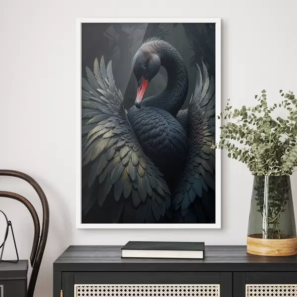Poster Un cisne negro con las alas desplegadas, mostrando sus llamativas plumas negras y su pico rojo sobre un fondo oscuro Nr f41249