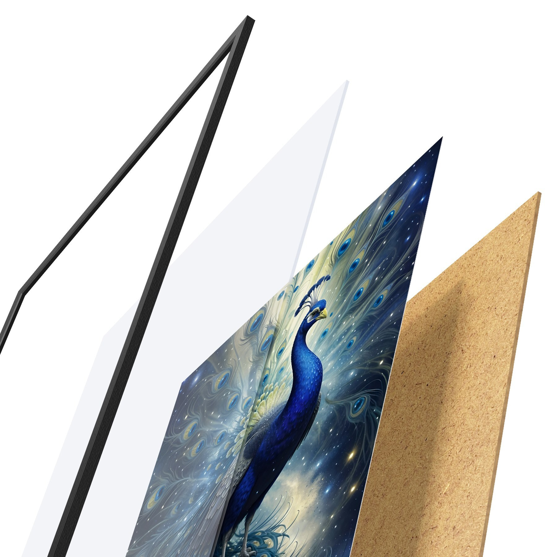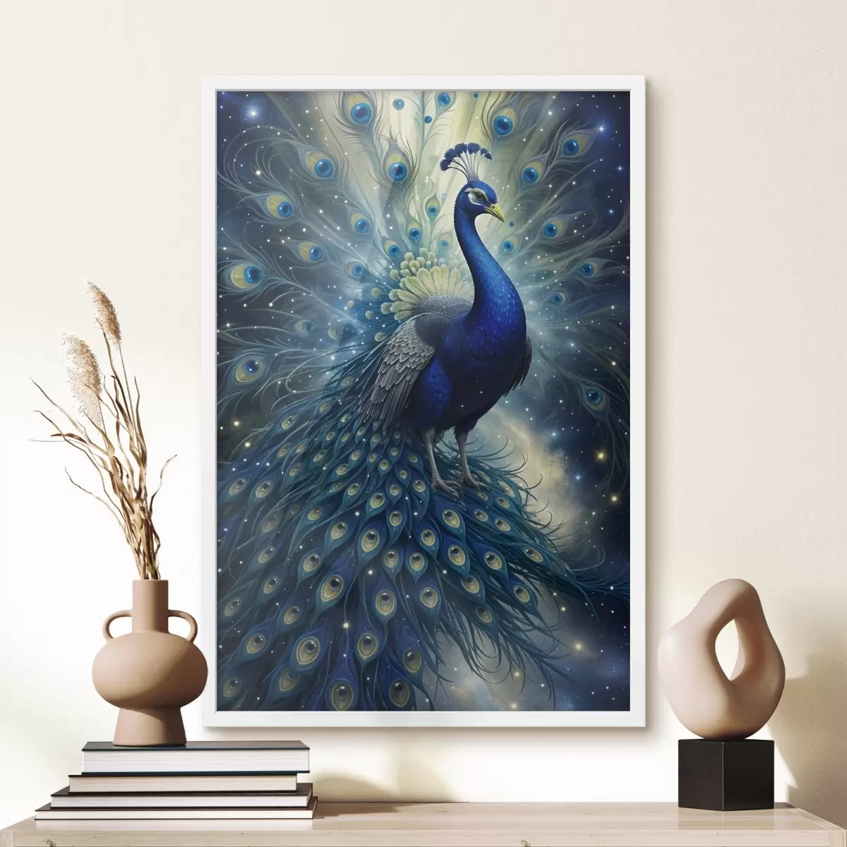 Poster Un pavo real vibrante y majestuoso contra un cielo nocturno estrellado, creando una atmósfera mágica y etérea f41256