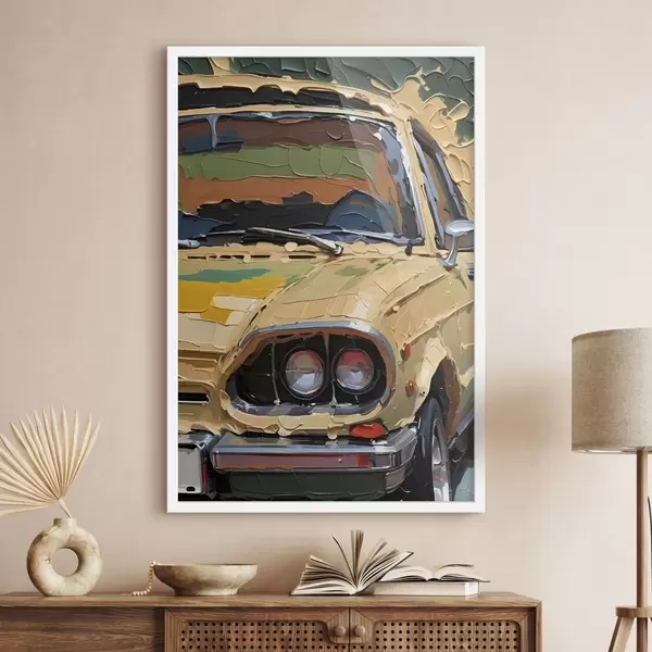 Poster Imitación de pintura al óleo empastada de coche amarillo sobre un fondo colorido y abstracto f41261