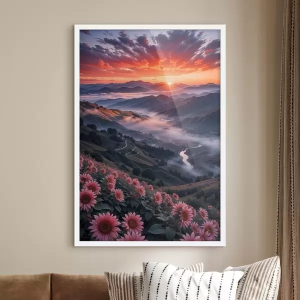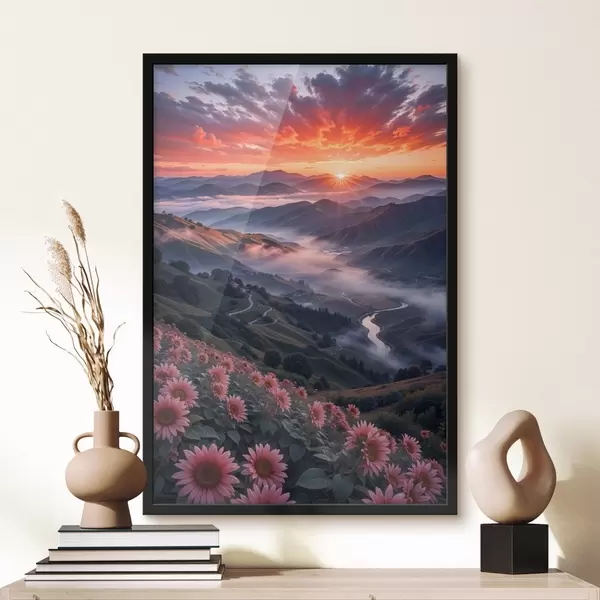 Poster Un impresionante paisaje con una vibrante puesta de sol sobre una región montañosa con racimos de flores rosas Nr f41263