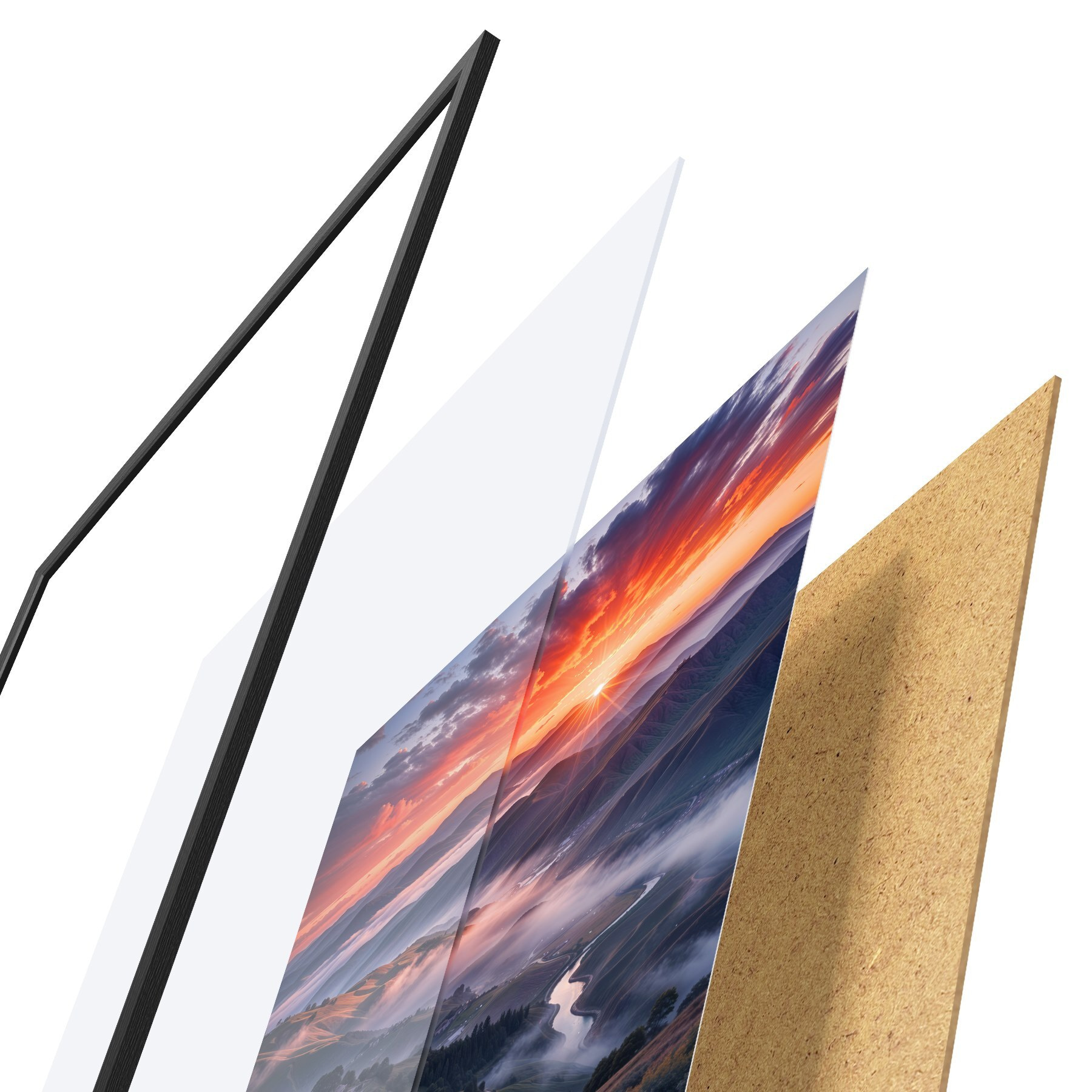 El póster consta de marco, plexiglás, imagen impresa y soporte de aglomerado. El póster puede colgarse inmediatamente en la pared gracias a los soportes de la parte posterior.