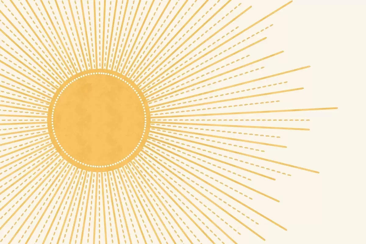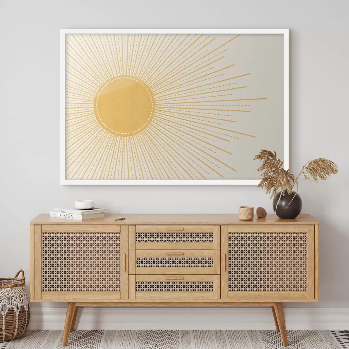 Poster Un sol amarillo brillante que irradia rayos de sol sobre un fondo claro, creando un ambiente cálido y soleado f41268
