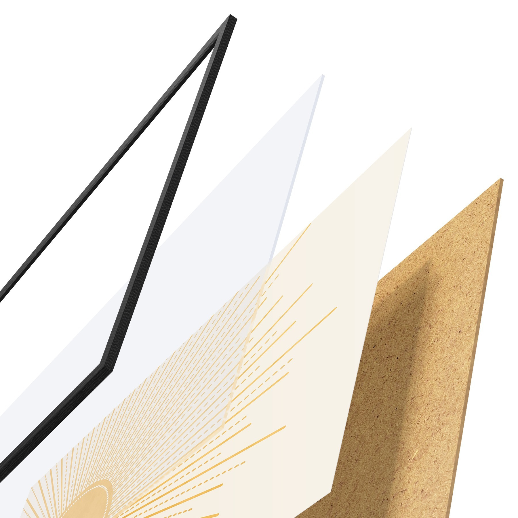 El póster consta de marco, plexiglás, imagen impresa y soporte de aglomerado. El póster puede colgarse inmediatamente en la pared gracias a los soportes de la parte posterior.