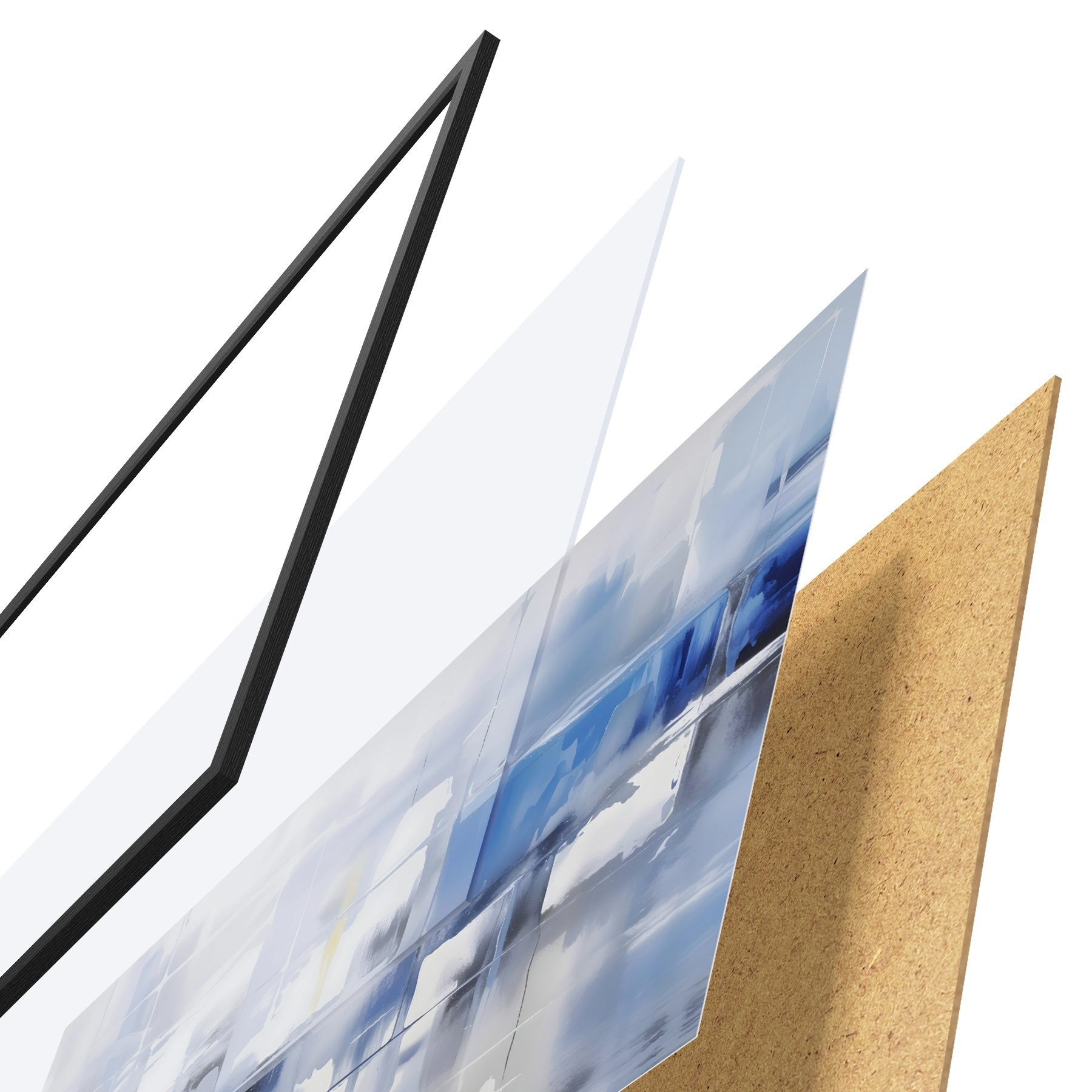 El póster consta de marco, plexiglás, imagen impresa y soporte de aglomerado. El póster puede colgarse inmediatamente en la pared gracias a los soportes de la parte posterior.