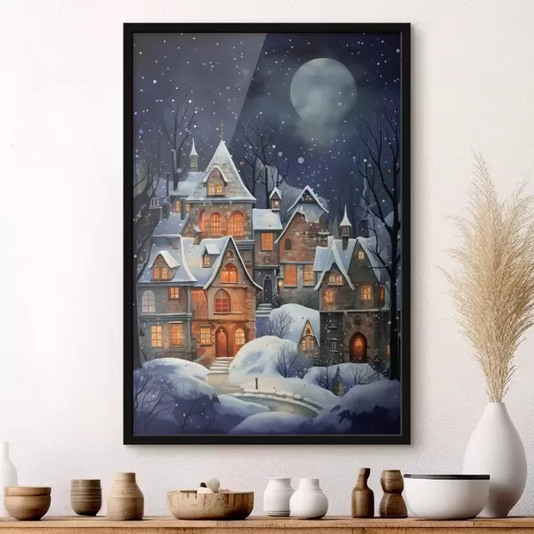 Poster Casas en la nieve con el cielo estrellado de fondo Nr f41276