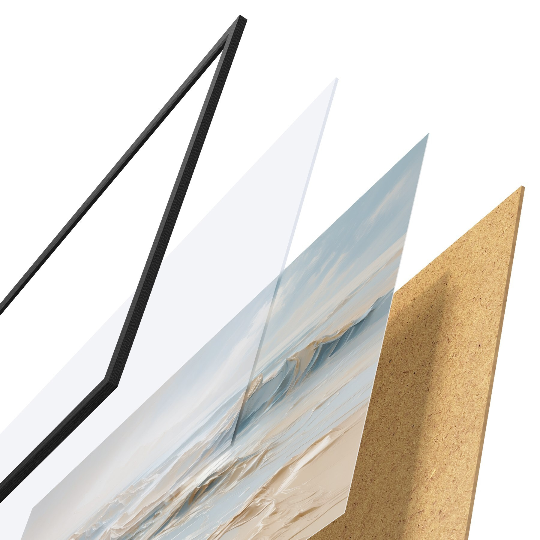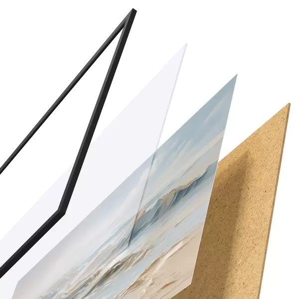 El póster consta de marco, plexiglás, imagen impresa y soporte de aglomerado. El póster puede colgarse inmediatamente en la pared gracias a los soportes de la parte posterior.