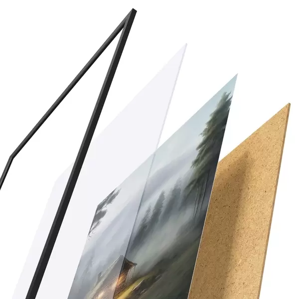 El póster consta de marco, plexiglás, imagen impresa y soporte de aglomerado. El póster puede colgarse inmediatamente en la pared gracias a los soportes de la parte posterior.