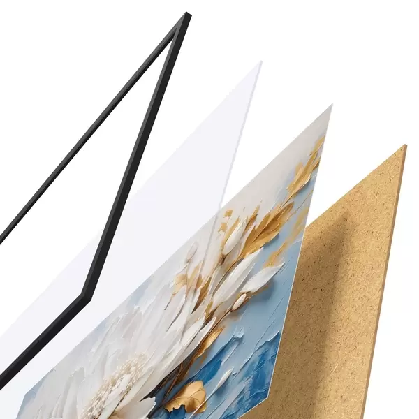 El póster consta de marco, plexiglás, imagen impresa y soporte de aglomerado. El póster puede colgarse inmediatamente en la pared gracias a los soportes de la parte posterior.