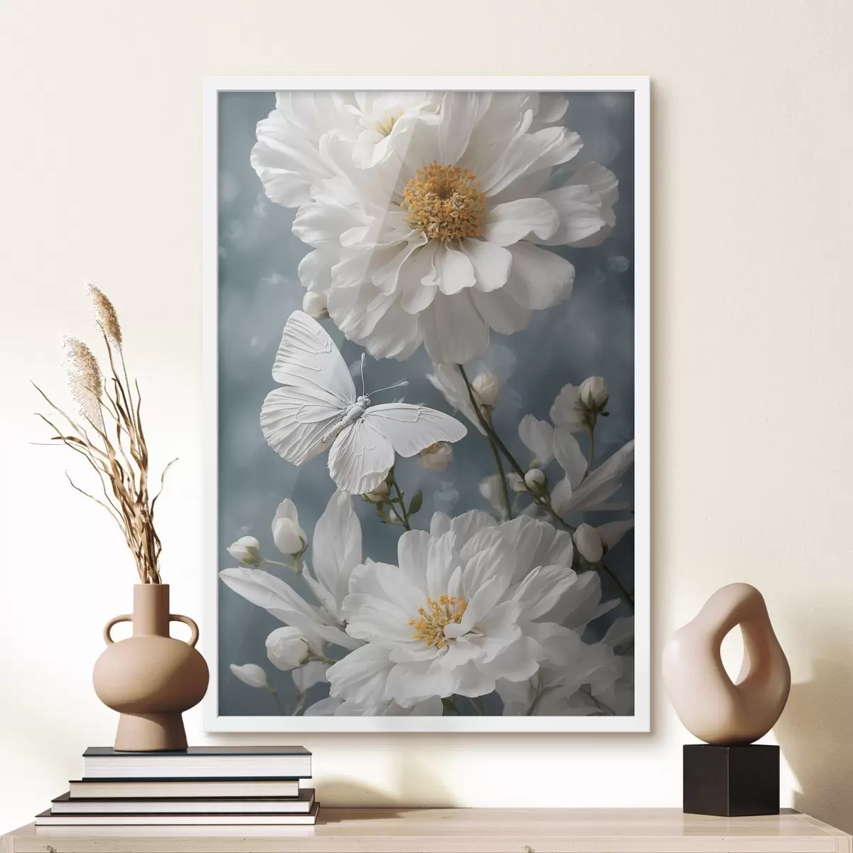 Poster Flores blancas y mariposa sobre fondo borroso Nr f41312