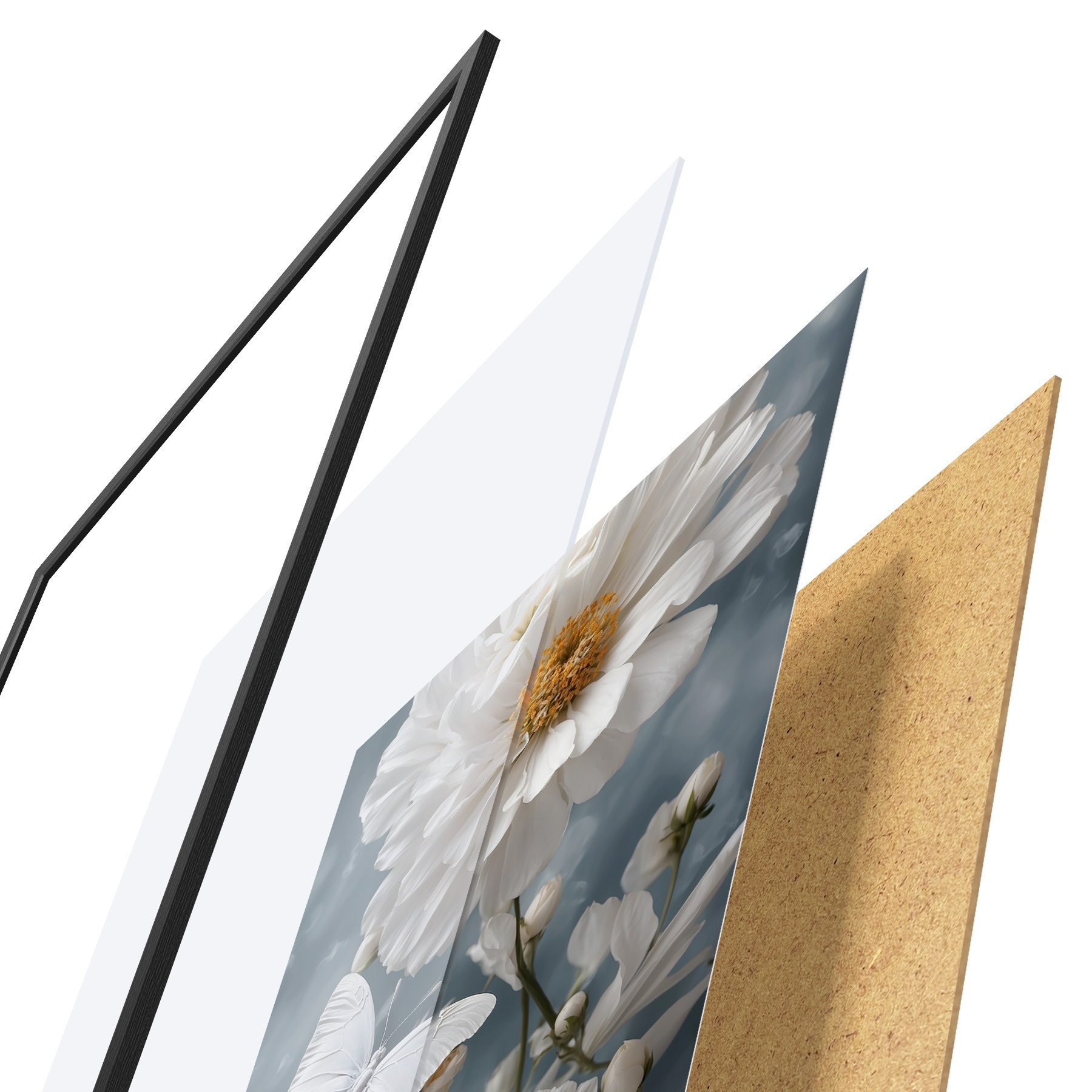 El póster consta de marco, plexiglás, imagen impresa y soporte de aglomerado. El póster puede colgarse inmediatamente en la pared gracias a los soportes de la parte posterior.