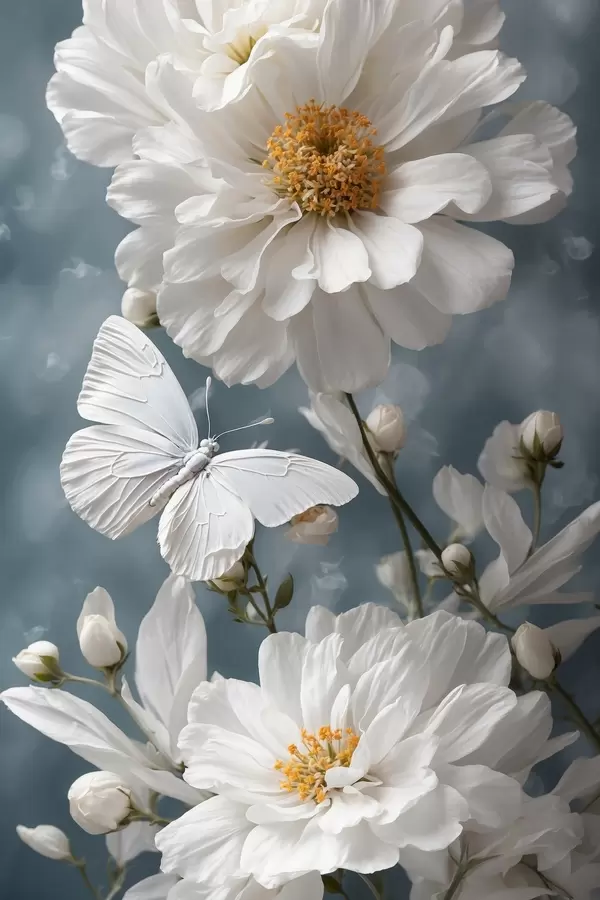 Poster Flores blancas y mariposa sobre fondo borroso Nr f41312