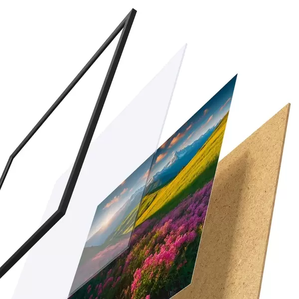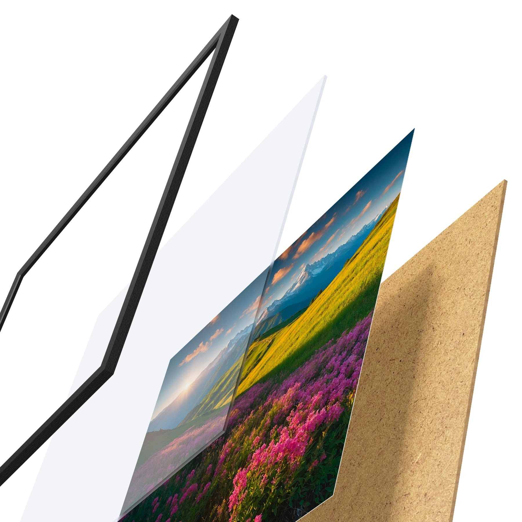 El póster consta de marco, plexiglás, imagen impresa y soporte de aglomerado. El póster puede colgarse inmediatamente en la pared gracias a los soportes de la parte posterior.
