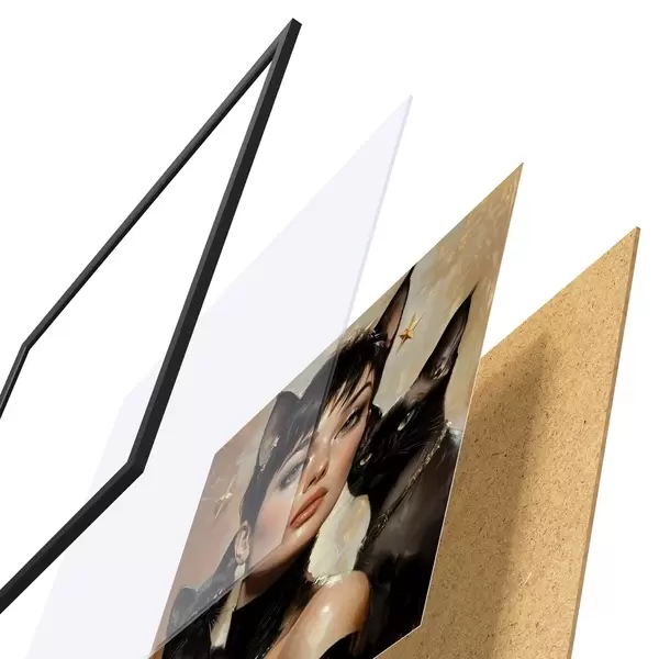 El póster consta de marco, plexiglás, imagen impresa y soporte de aglomerado. El póster puede colgarse inmediatamente en la pared gracias a los soportes de la parte posterior.