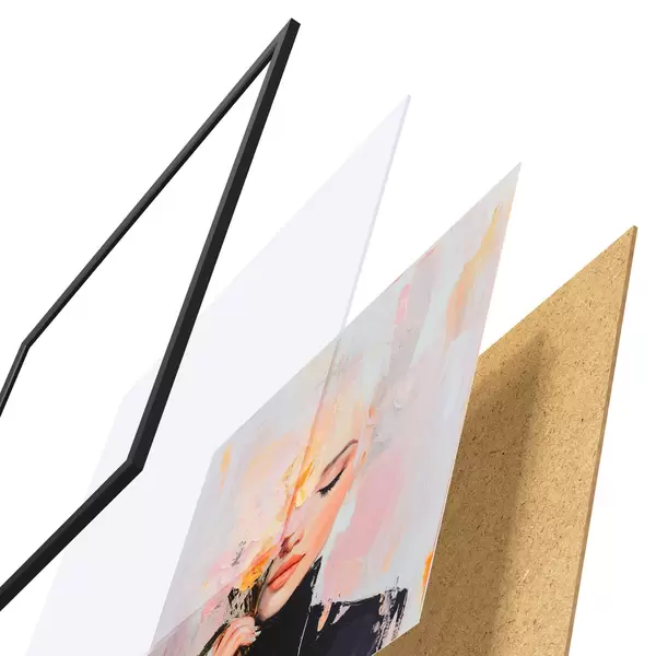 El póster consta de marco, plexiglás, imagen impresa y soporte de aglomerado. El póster puede colgarse inmediatamente en la pared gracias a los soportes de la parte posterior.