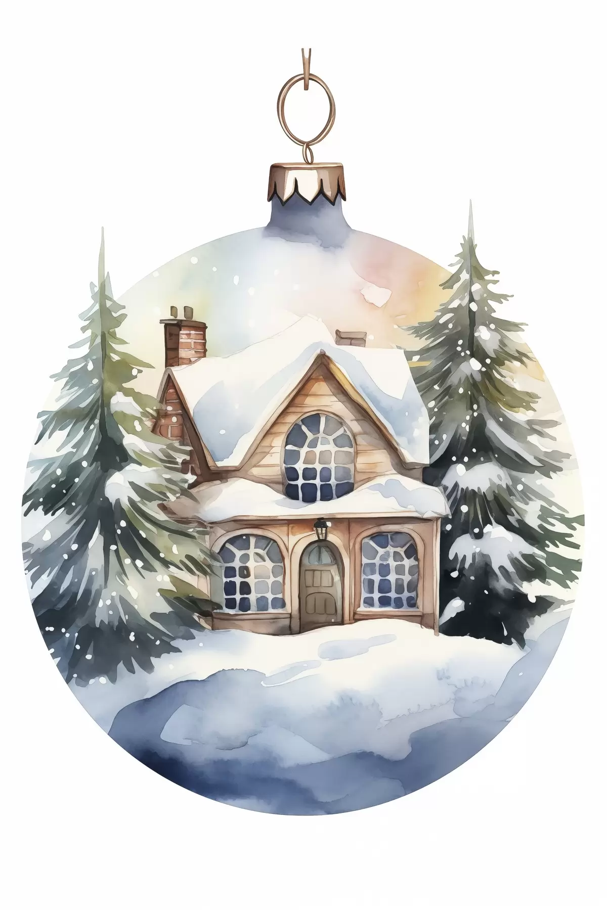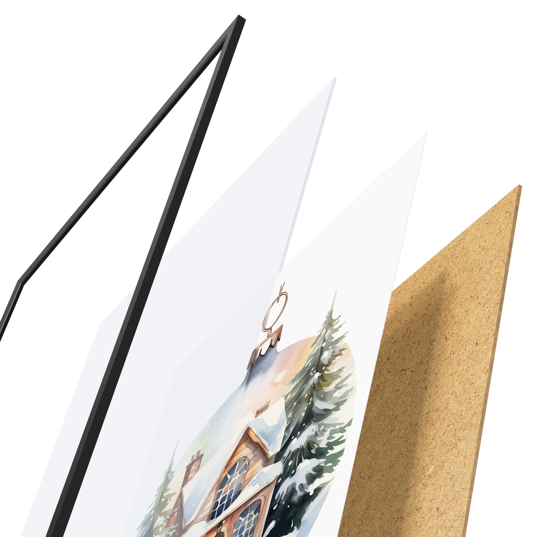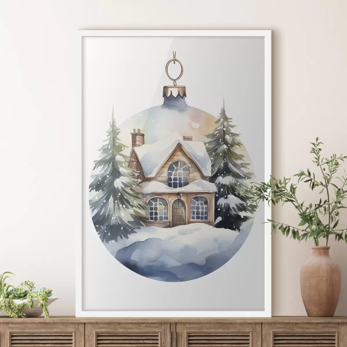 Poster Bola decorativa de Navidad con casa de acuarela en la nieve, pinos Nr f41363
