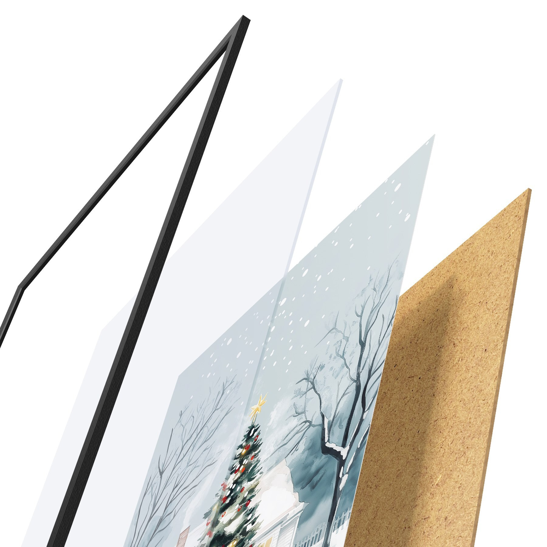 El póster consta de marco, plexiglás, imagen impresa y soporte de aglomerado. El póster puede colgarse inmediatamente en la pared gracias a los soportes de la parte posterior.