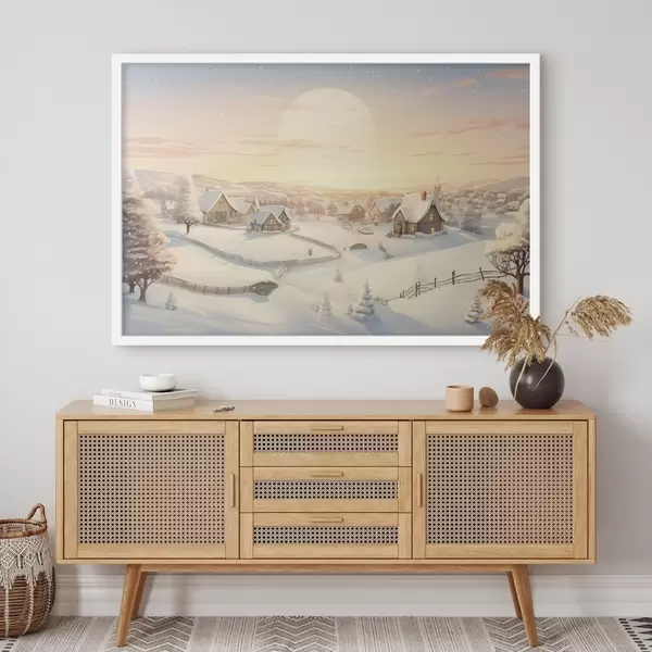 Poster Pueblo de invierno al atardecer, casas cubiertas de nieve, pinos Nr f41380