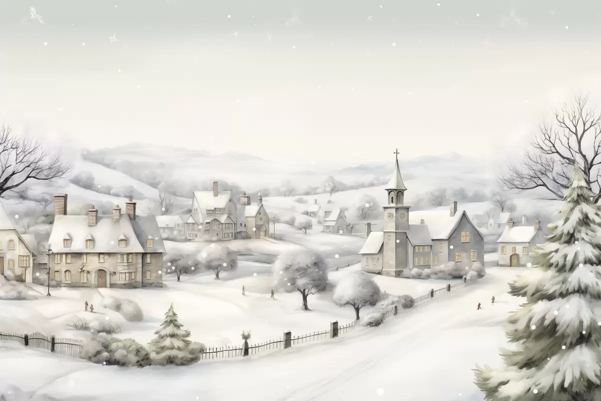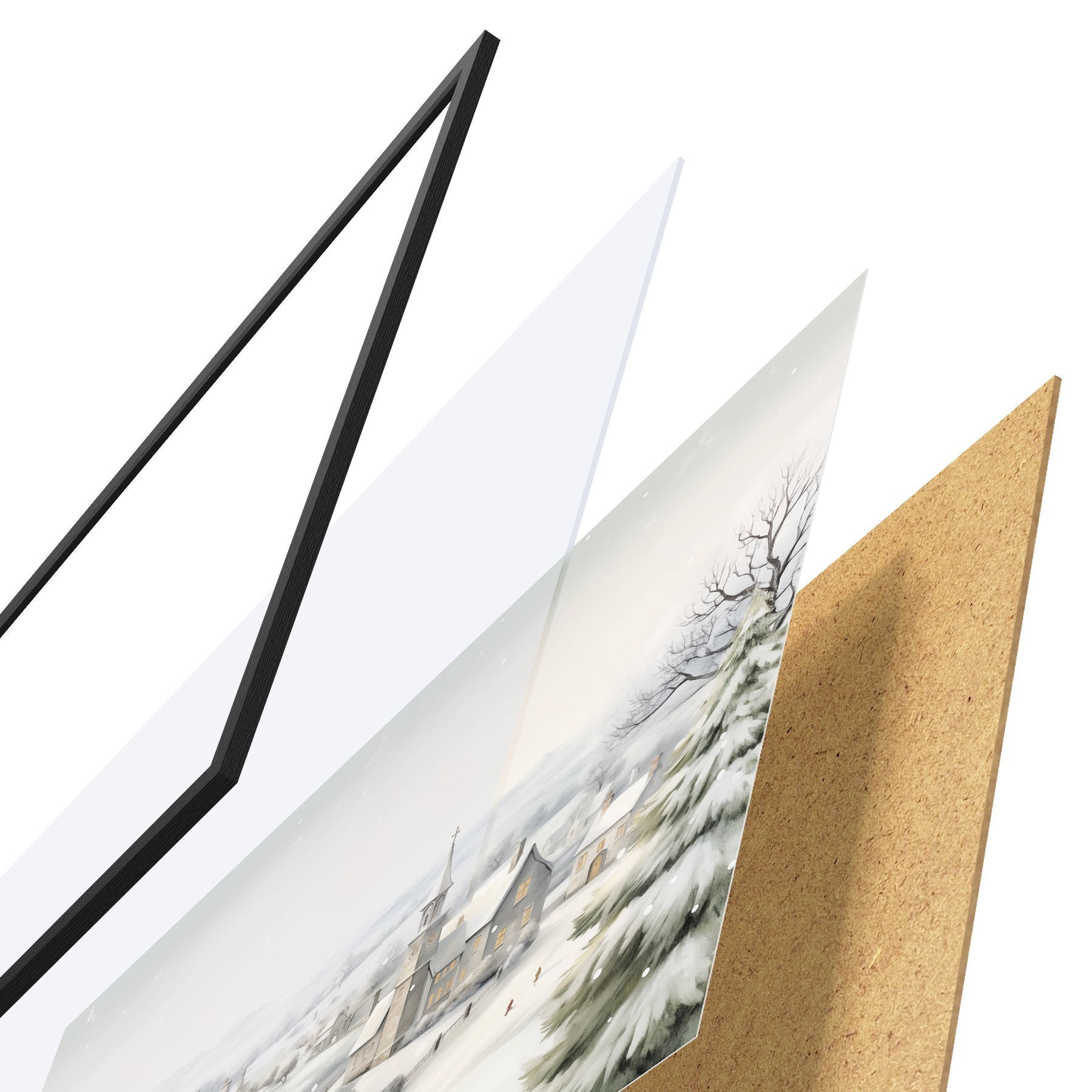 Poster Hermoso pueblo de invierno, árboles, casas, acuarela, montañas Nr f41382