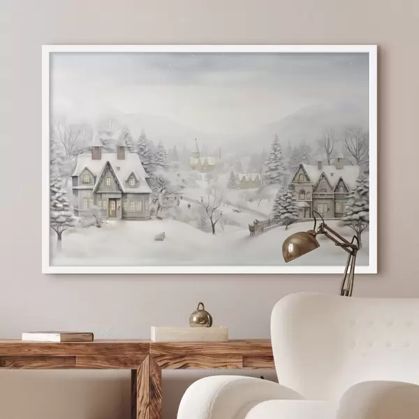 Poster Hermoso paisaje de invierno con pueblo, pinos, casas, montañas f41384