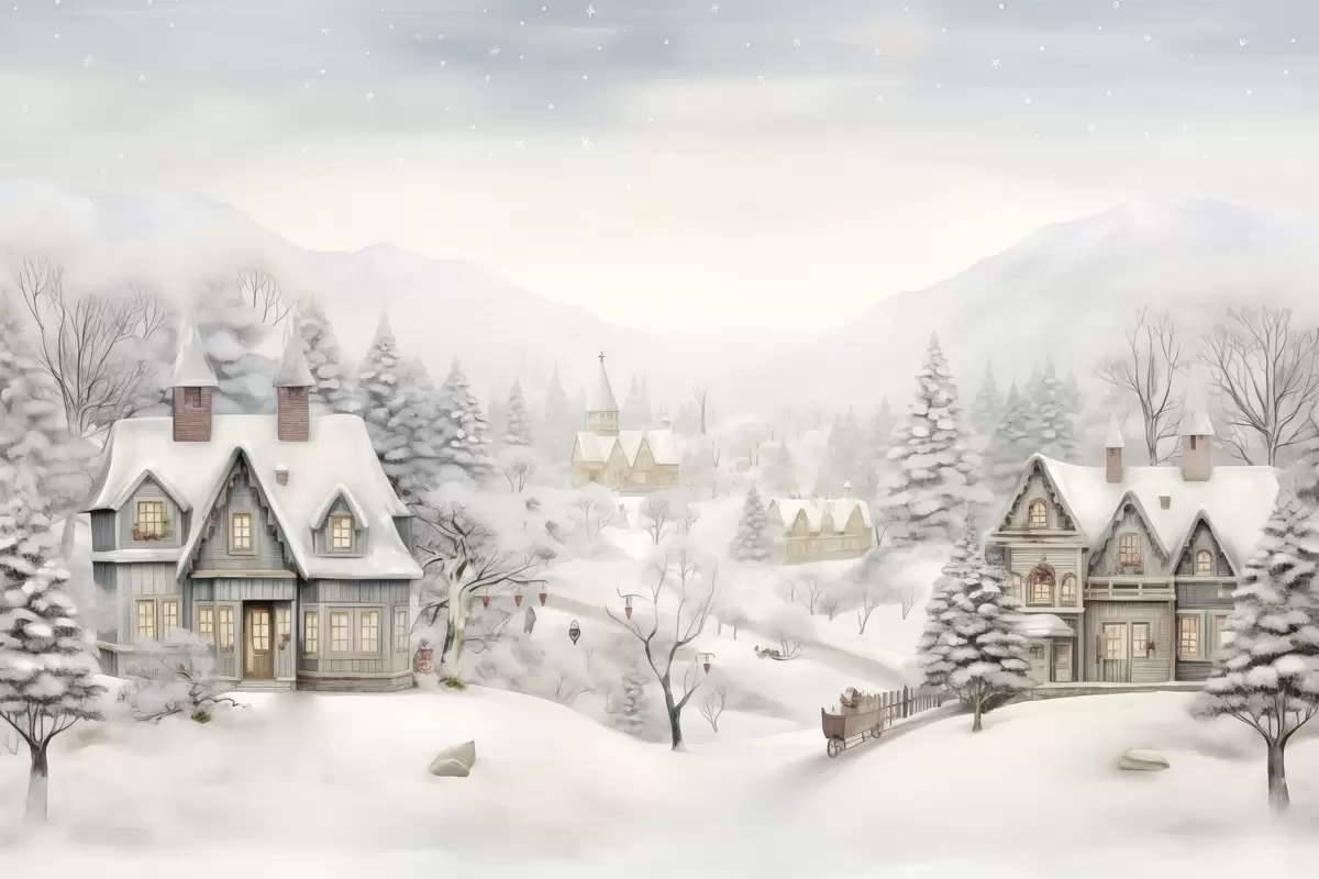 Poster Hermoso paisaje de invierno con pueblo, pinos, casas, montañas f41384