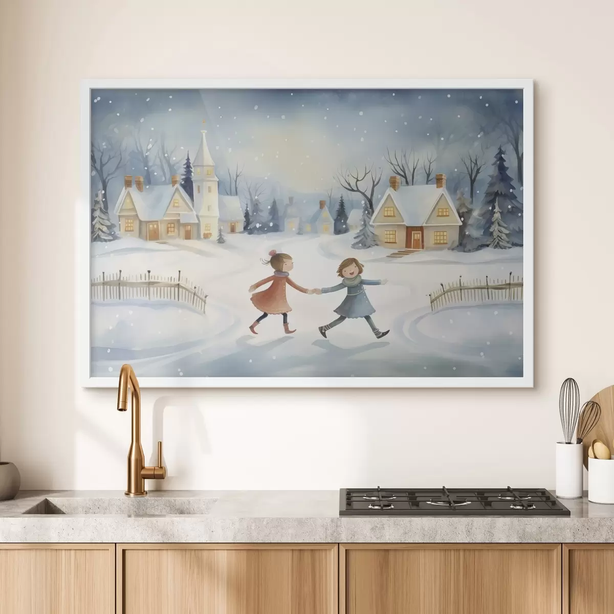 Poster Niñas en el pueblo de invierno, copos de nieve, acuarela, casas, bosque f41385