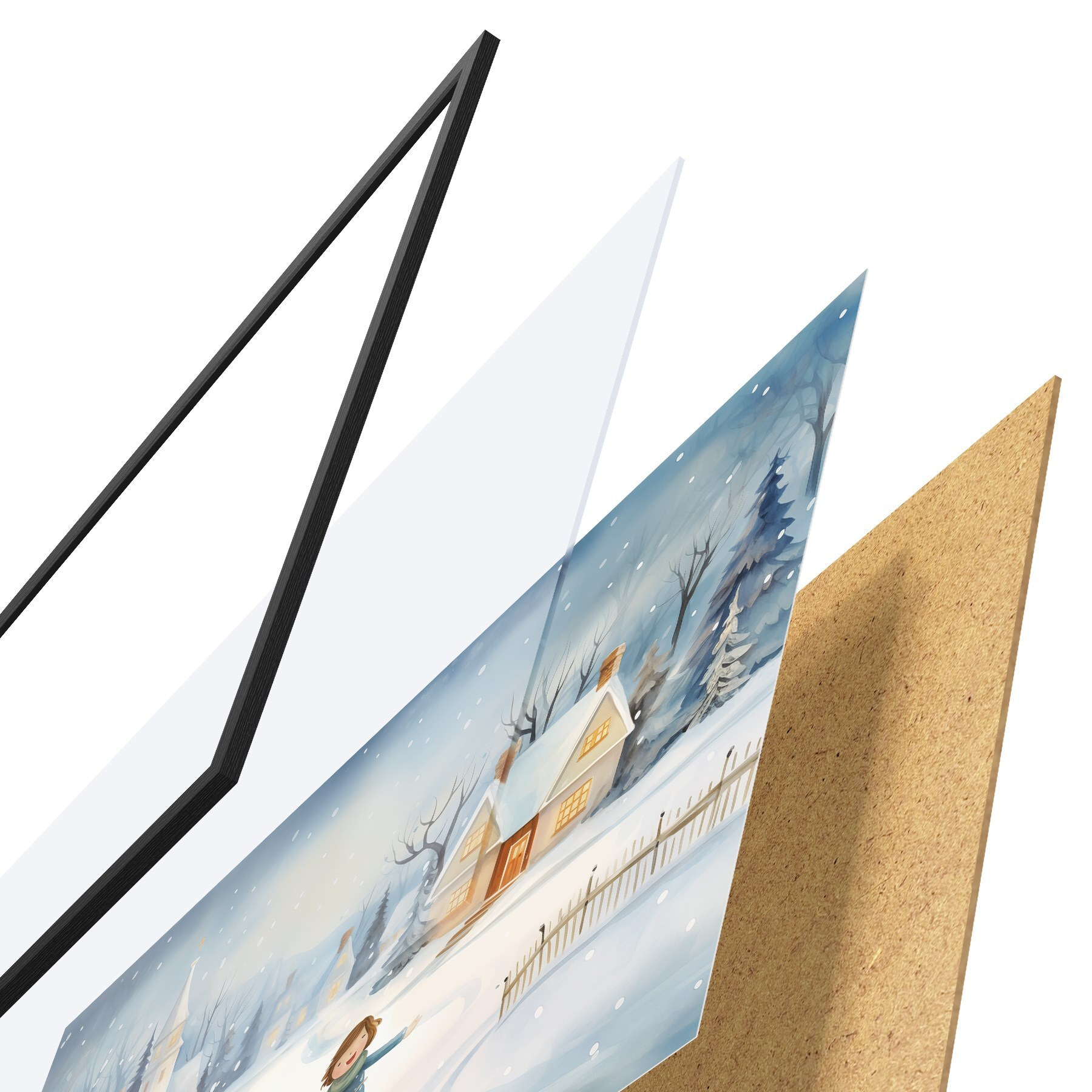 El póster consta de marco, plexiglás, imagen impresa y soporte de aglomerado. El póster puede colgarse inmediatamente en la pared gracias a los soportes de la parte posterior.