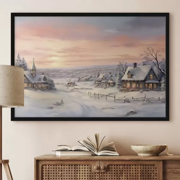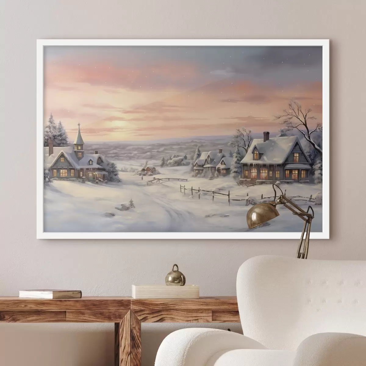 Poster Puesta de sol en el pueblo de invierno, rústico, acuarela, copos de nieve f41386