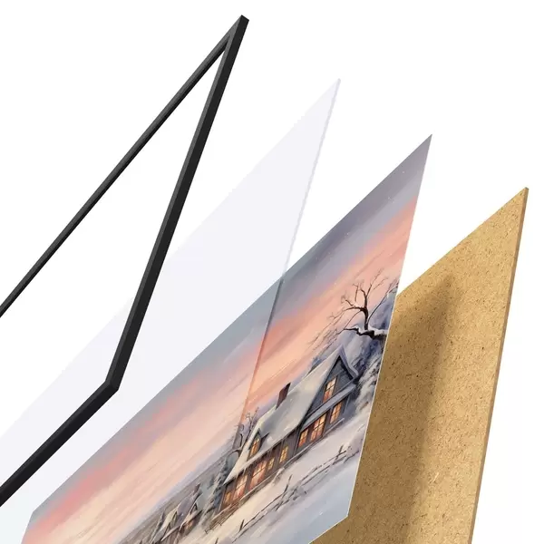 El póster consta de marco, plexiglás, imagen impresa y soporte de aglomerado. El póster puede colgarse inmediatamente en la pared gracias a los soportes de la parte posterior.