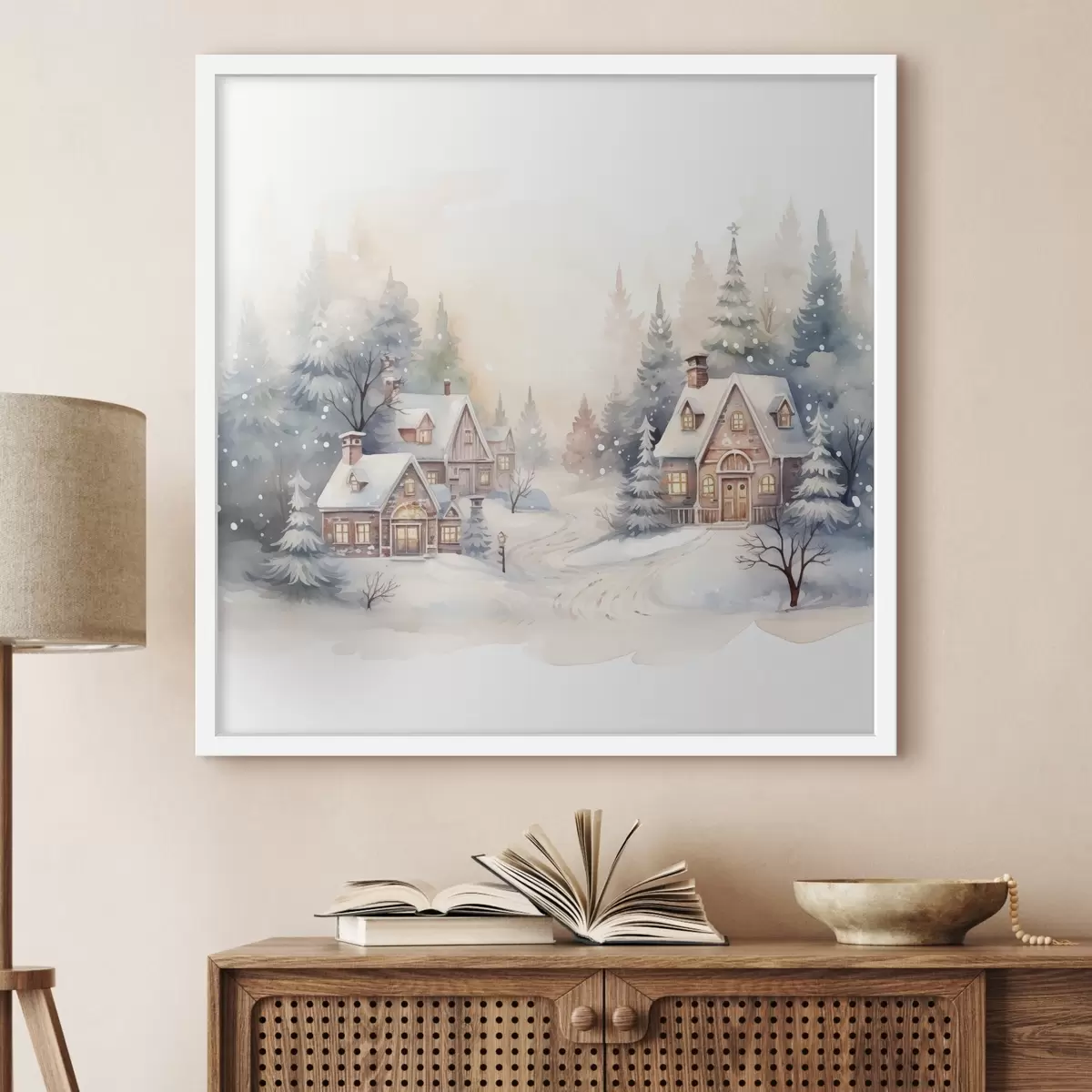 Poster Paisaje de invierno, bosque de pinos, hermosas casas, acuarela, susnet Nr f41390