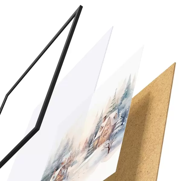 El póster consta de marco, plexiglás, imagen impresa y soporte de aglomerado. El póster puede colgarse inmediatamente en la pared gracias a los soportes de la parte posterior.