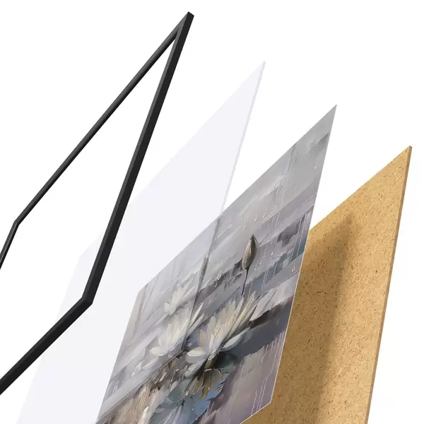 El póster consta de marco, plexiglás, imagen impresa y soporte de aglomerado. El póster puede colgarse inmediatamente en la pared gracias a los soportes de la parte posterior.