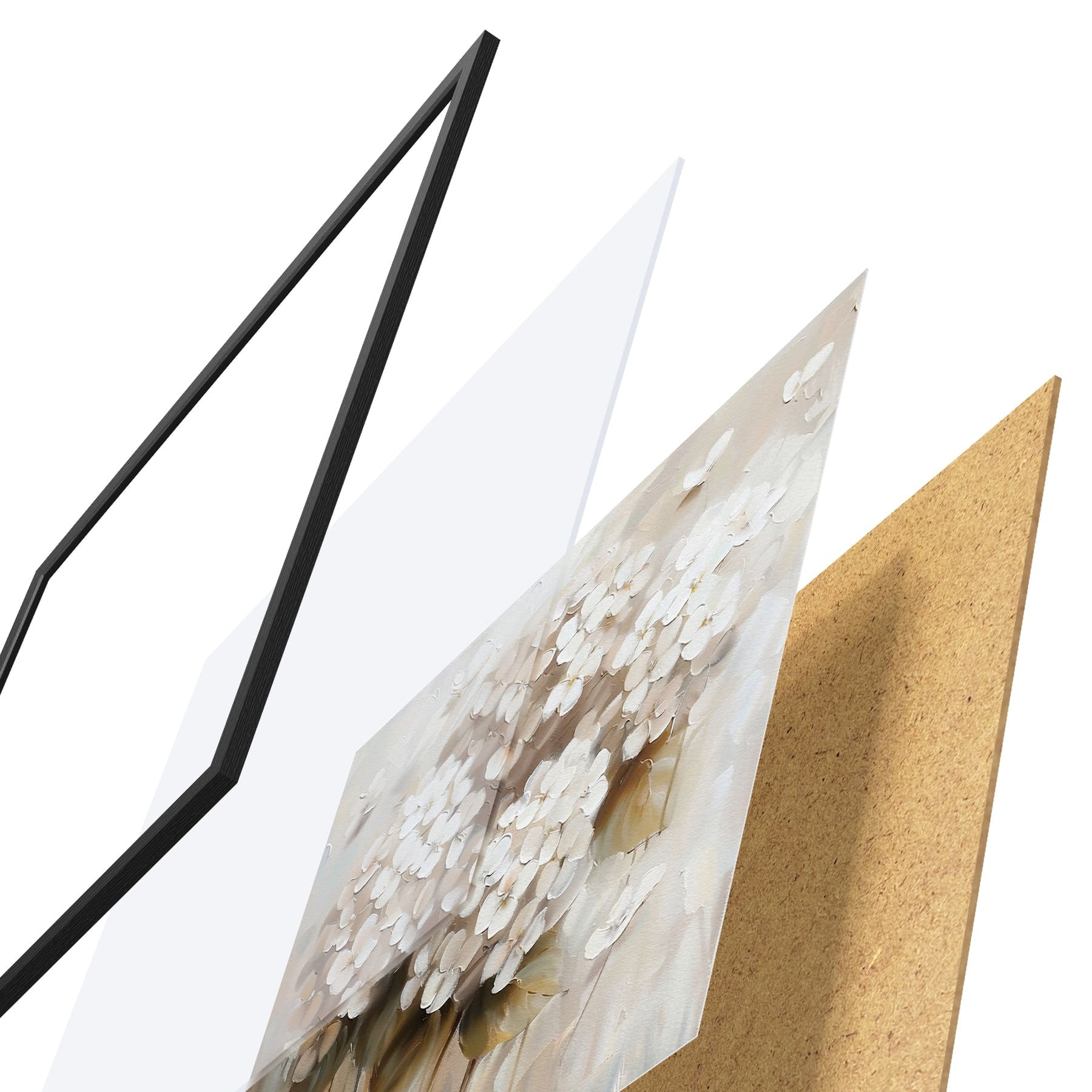 El póster consta de marco, plexiglás, imagen impresa y soporte de aglomerado. El póster puede colgarse inmediatamente en la pared gracias a los soportes de la parte posterior.