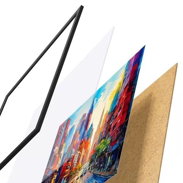 El póster consta de marco, plexiglás, imagen impresa y soporte de aglomerado. El póster puede colgarse inmediatamente en la pared gracias a los soportes de la parte posterior.