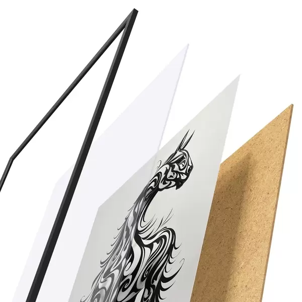 El póster consta de marco, plexiglás, imagen impresa y soporte de aglomerado. El póster puede colgarse inmediatamente en la pared gracias a los soportes de la parte posterior.