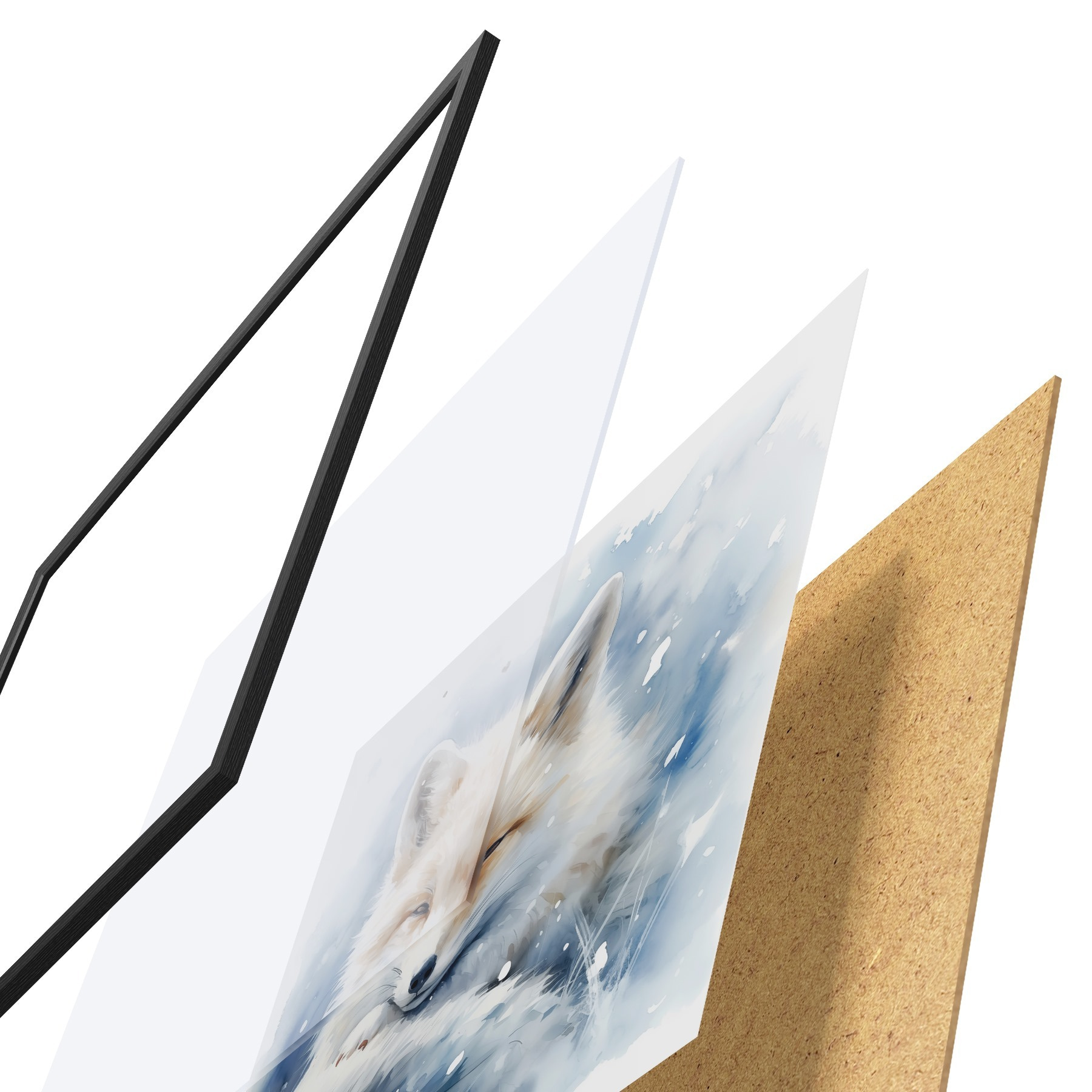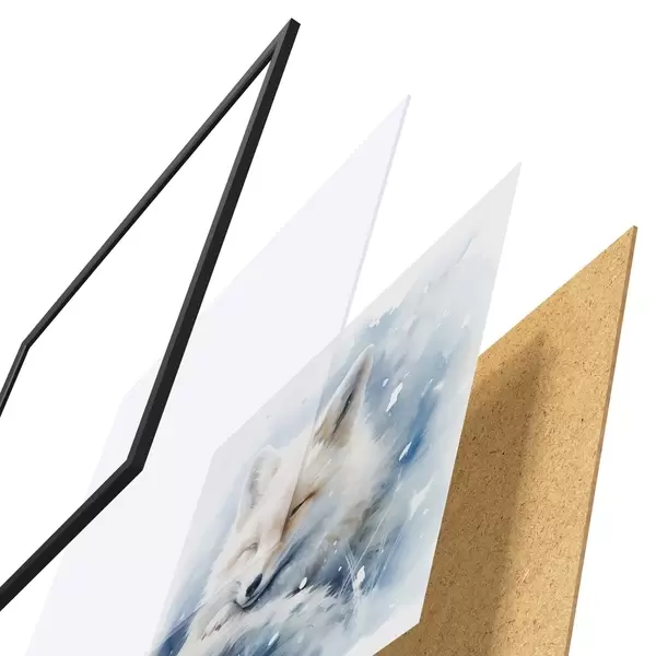 El póster consta de marco, plexiglás, imagen impresa y soporte de aglomerado. El póster puede colgarse inmediatamente en la pared gracias a los soportes de la parte posterior.