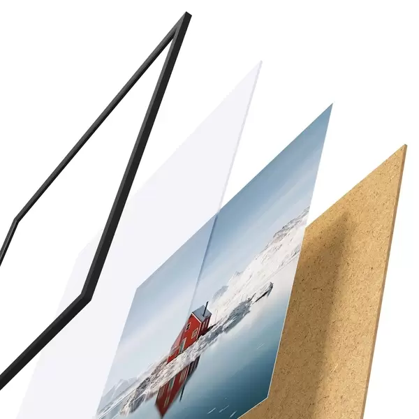 El póster consta de marco, plexiglás, imagen impresa y soporte de aglomerado. El póster puede colgarse inmediatamente en la pared gracias a los soportes de la parte posterior.