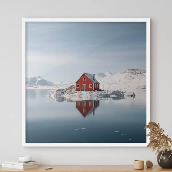 Poster Paisaje invernal minimalista casa roja junto al lago Nr f41437