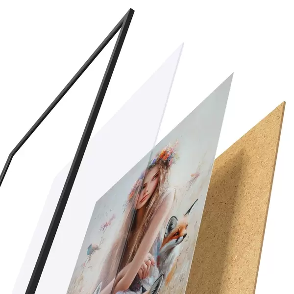 El póster consta de marco, plexiglás, imagen impresa y soporte de aglomerado. El póster puede colgarse inmediatamente en la pared gracias a los soportes de la parte posterior.