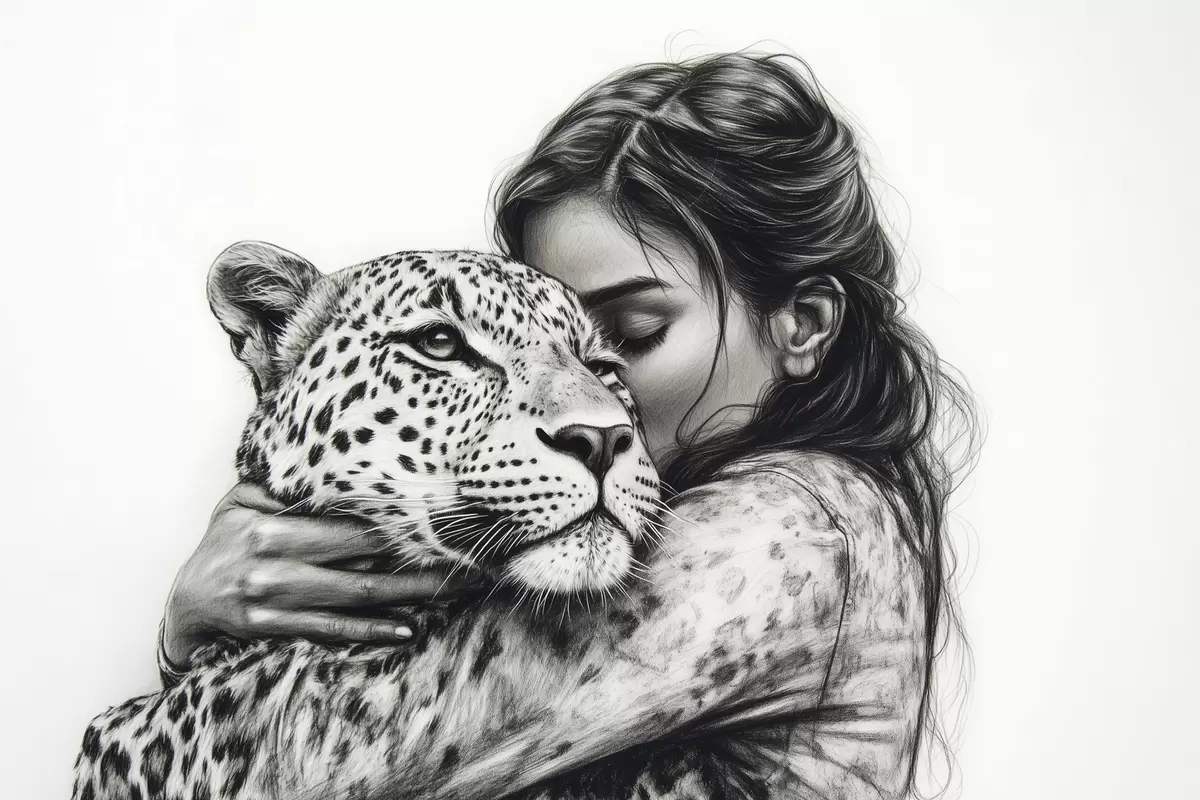 Poster Mujer con leopardo, animales salvajes, dibujo a lápiz, blanco y negro f41455