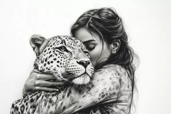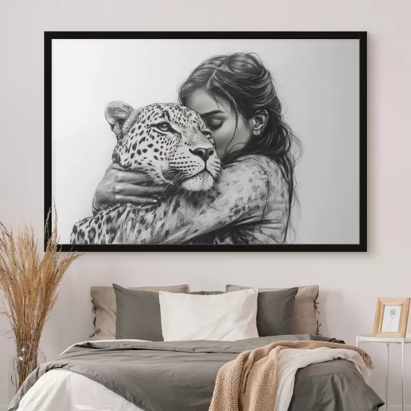 Poster Mujer con leopardo, animales salvajes, dibujo a lápiz, blanco y negro Nr f41455