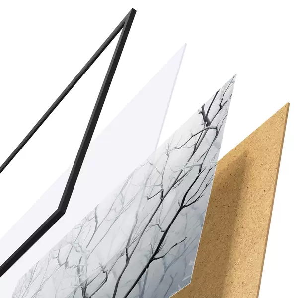 El póster consta de marco, plexiglás, imagen impresa y soporte de aglomerado. El póster puede colgarse inmediatamente en la pared gracias a los soportes de la parte posterior.
