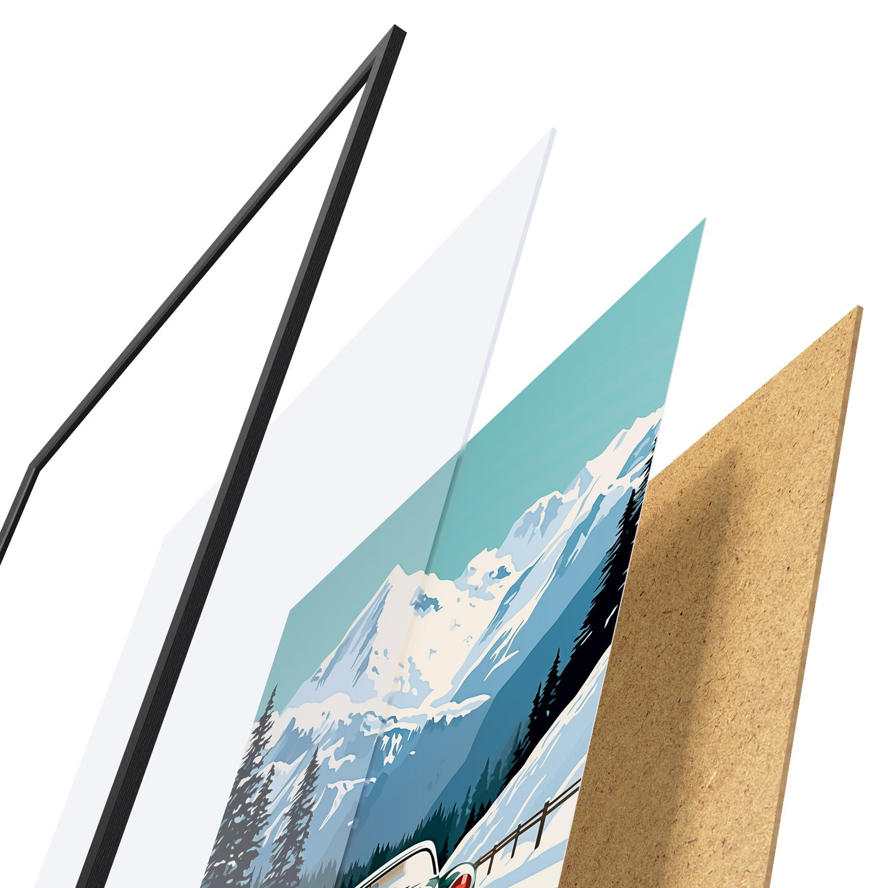 El póster consta de marco, plexiglás, imagen impresa y soporte de aglomerado. El póster puede colgarse inmediatamente en la pared gracias a los soportes de la parte posterior.