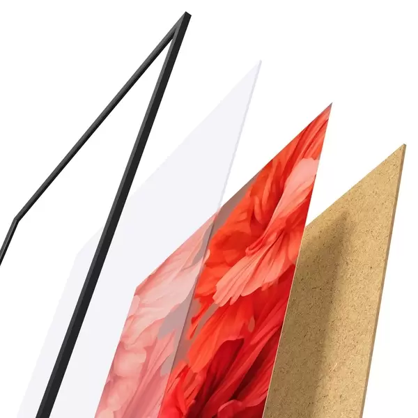 El póster consta de marco, plexiglás, imagen impresa y soporte de aglomerado. El póster puede colgarse inmediatamente en la pared gracias a los soportes de la parte posterior.