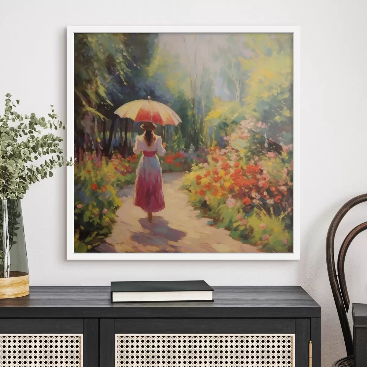Poster Dama con sombrilla en un jardín en flor Nr f41495