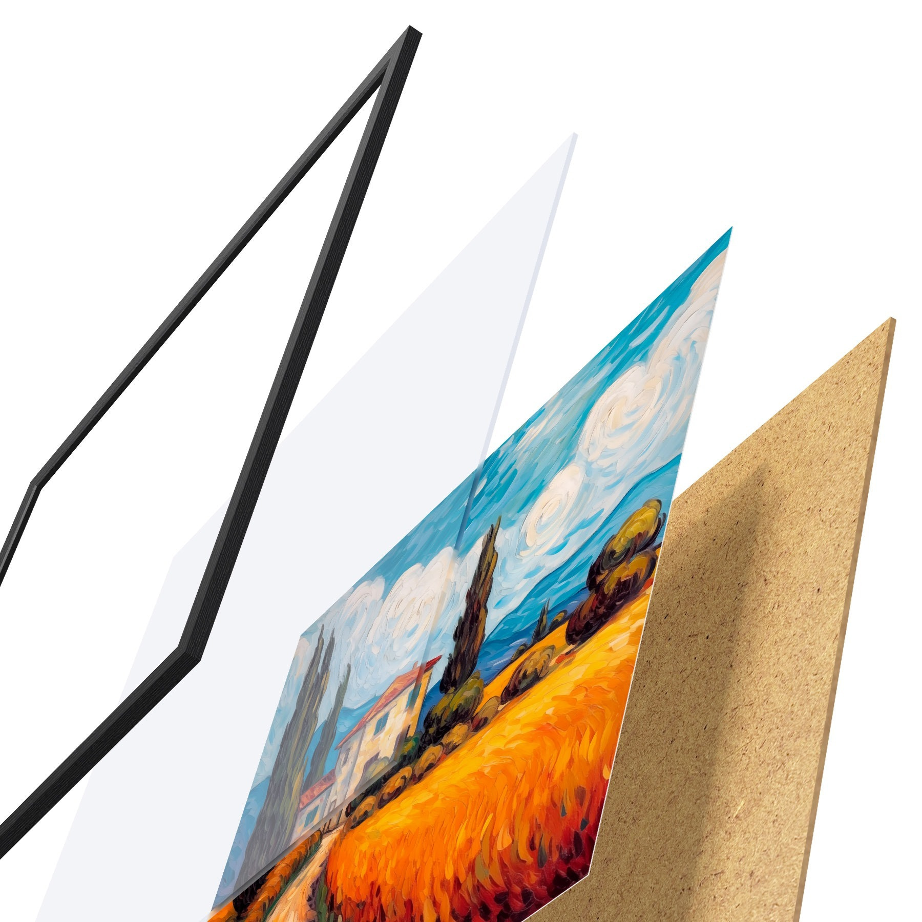 El póster consta de marco, plexiglás, imagen impresa y soporte de aglomerado. El póster puede colgarse inmediatamente en la pared gracias a los soportes de la parte posterior.
