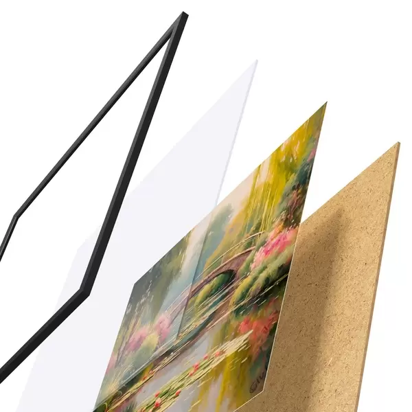 El póster consta de marco, plexiglás, imagen impresa y soporte de aglomerado. El póster puede colgarse inmediatamente en la pared gracias a los soportes de la parte posterior.