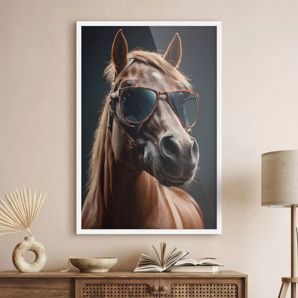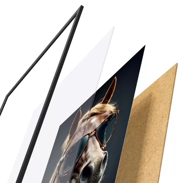 El póster consta de marco, plexiglás, imagen impresa y soporte de aglomerado. El póster puede colgarse inmediatamente en la pared gracias a los soportes de la parte posterior.
